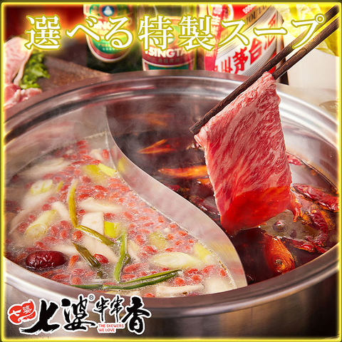 当店人気ナンバーワン☆辛味の刺激がクセになる七婆特製の麻辣出汁とあっさりながらコクのある七婆特製出汁のコンビです♪マーラースープの辛さは4段階から選べるので辛さが苦手な方も安心です。また薬膳なので健康にも良く女性人気も抜群な逸品◎お好きな具材をそれぞれのスープでお楽しみください♪渋谷での宴会・飲み会・接待にも◎
