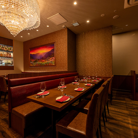 華やかで洗練された雰囲気の店内は、女子会や合コンにぴったりの空間です。シャンデリアの灯りが料理を美しく照らし、会話がより一層盛り上がります。少人数でもゆったりと座れるテーブル席は心地よく、料理やドリンクとともに非日常を楽しめます。特別感がありながらも気軽に利用できるバランスが魅力です。