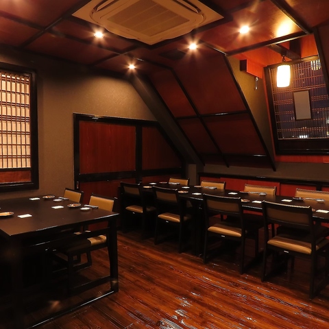 【最大40名まで利用可能。和モダンでスタイリッシュな個室を完備】職人が仕上げたという見事な壁が目を惹く完全個室は、15名まで収容可。3部屋用意されており、仕切りを外してつなげると、40名まで利用できます。周りを気にせず、食事や会話を満喫したい時にオススメです。お気軽にご来店ください。