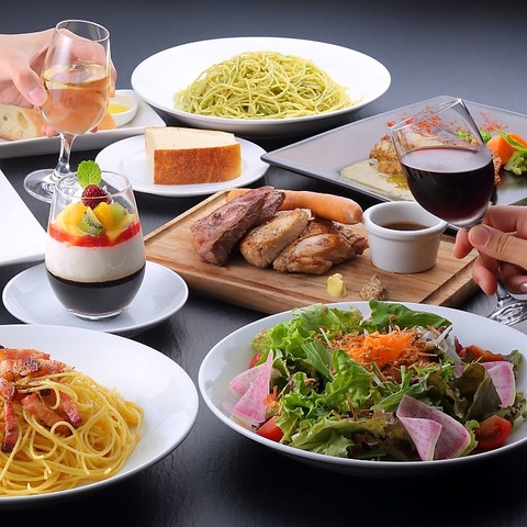 前菜盛り合わせ、本日のカルパッチョ、10種から選べるパスタ、5種から選べるデザート、ドリンク
