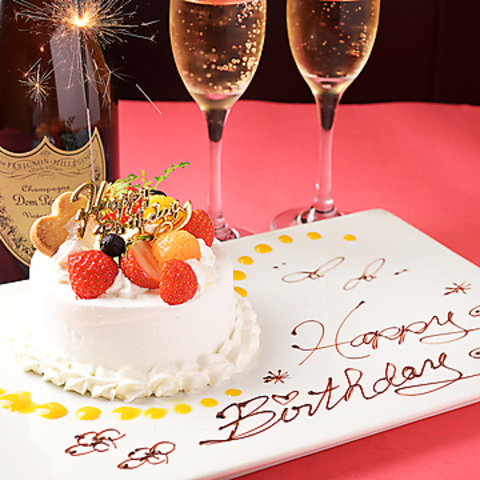 ご予約人数に合わせたホールケーキに、飲み放題がついた記念日コースをご用意。デートや記念日・誕生日などもお気軽にお愉しみいただけます。