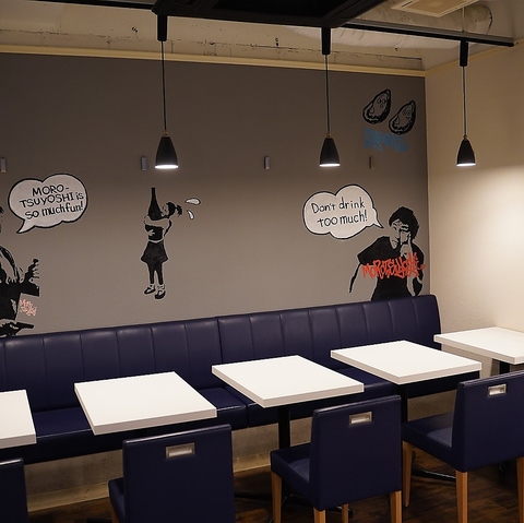 壁一面に描かれたおしゃれなイラストが印象的な、落ち着いた空間が広がっています。少人数でのご利用に最適なテーブル席は、親しい仲間とのお食事にぴったり!お店を丸ごと貸し切っての各種宴会も承っておりますので、ご希望の方はお気軽にご相談ください◎