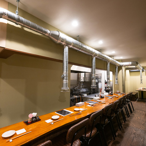 木の温もりが心地よいカウンター席は、落ち着いた雰囲気でゆっくり過ごせる人気のお席。目の前で調理が見えるライブ感も楽しめます。デートで会話が弾む距離感はもちろん、サクッと飲みたい時にも使いやすい、気軽で居心地のよいカウンターです。