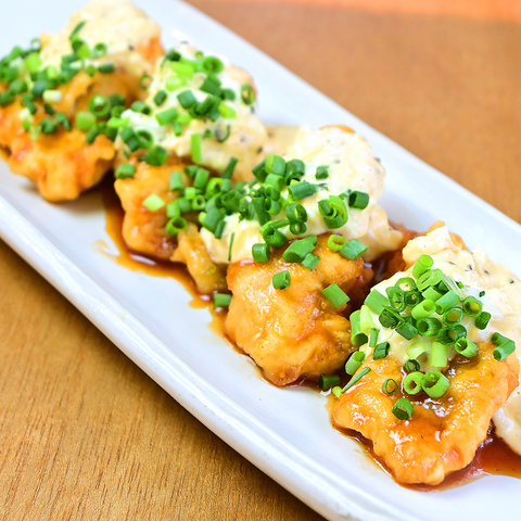 タルタル好きにはたまらない♪卵をたっぷりと使用したタルタルチキン南蛮です。衣サクサクでジューシーに揚げた鶏肉を甘酢ソースと、酸味を抑え玉子感を楽しむタルタルソースでお召し上がりください。