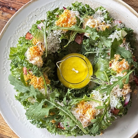 たっぷりの野菜を摂るなら、「グリーンリースサラダセット」がおすすめ。彩の旬野菜をリース状に丁寧に盛り付け生ハムとスモークサーモンマリネで食べ応えもあり。絶妙な酸味のオリジナルドレッシングでまとめた、当店の看板メニュー。