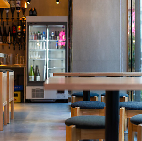 店内は優しい木目のテーブルや椅子が並ぶスタイリッシュな空間。居心地のよいテーブル席もありおひとり様からご宴会まで大歓迎◎