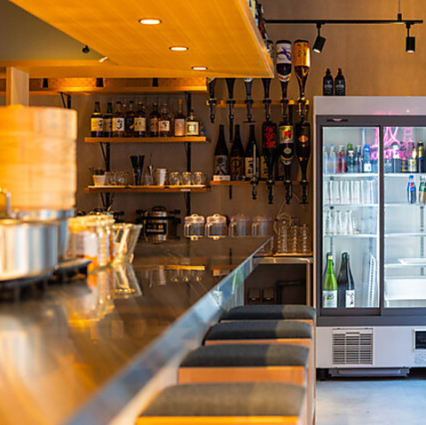 ネオン管の看板が特徴的なガラス張りの開放的な外観☆大皿料理が並ぶライブ感のあるカウンター席は、ステンレスキッチンがフラットになっていてスタッフとコミュニケーションを楽しめます!