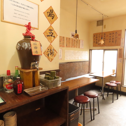 【テーブル席】カウンター席の横にテーブル席をご用意しております。ゆっくり滞在したい時や女子会、気の置けない友人との飲み会などにおすすめのお席です。とってもお得な1時間紹興酒飲み放題(1000円(税込))をご用意しているので、みんなでシェアして楽しむこともできます。スパイスが効いた本場中華料理と一緒にどうぞ♪