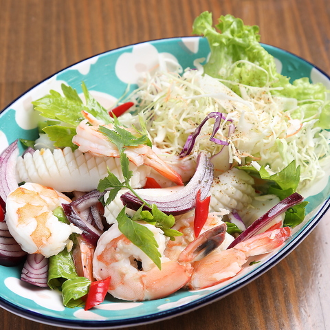 プリプリの海老と春雨を、ナンプラーやライム、唐辛子で和えたタイ風サラダ。爽やかな酸味と後引く辛さが特徴で、ビールのおつまみに最適です!ヘルシーなので、夜遅い時間のお食事や、もう一品欲しい時にも罪悪感なく楽しめる人気メニューです。