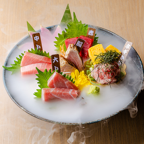 贅沢な本鮪と肉料理をバランス良く楽しめる全8品。大トロを使用した濃厚な本鮪ネギトロだし玉子、鮪の旨味が引き立つオイル漬けサラダ、鮮度抜群の脳天たたきと続きます。職人が順に焼き上げるおまかせやきとんで香ばしさを堪能し、名物のデカチキン南蛮は自家製明太子タルタルで満足度も◎
