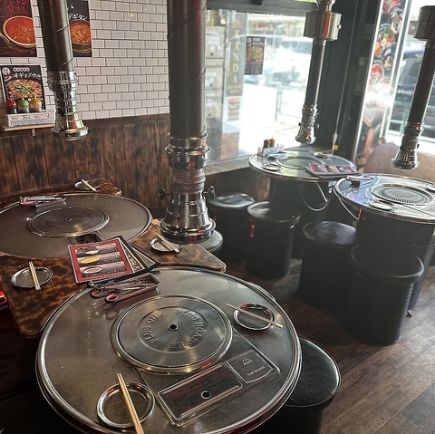 ドラム缶をテーブルとして使用し、その上で焼肉を楽しむスタイルは、新大久保などの韓国料理店で人気を博しています。換気ダクトが各テーブルに設置されており、本格的な焼肉店です。仲間とワイワイ焼肉を楽しむのにぴったりな空間です。
