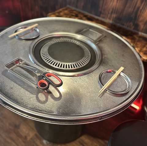 韓国料理店で使われる円形の鉄板テーブルです。中央の網で肉や野菜を焼き、鉄板の溝にたまった脂を利用してキムチやニンニクを焼くことができます。焼き肉用のトングやハサミも置かれており、本格的な韓国焼肉が楽しめます。