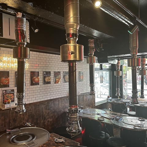 開放的な窓際に設置されたドラム缶テーブルです。円形の鉄板と上から吊り下げられた換気ダクトが特徴的です。通路側に面した席もあり、賑やかな雰囲気の中、気軽に焼肉を楽しめる空間です。まるで韓国の屋台にきたような気分になります。