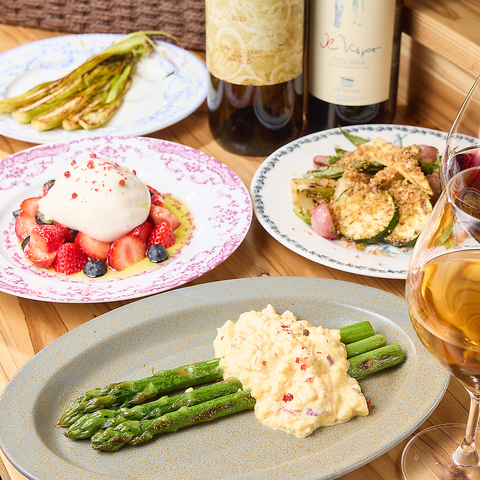 オーナーの実家が育てた自家製野菜を使用した、華やかで色鮮やかなイタリアンを提供しています。新鮮な野菜の旬の味わいを活かし、彩り豊かな一皿一皿が目を引く美しさ!手作りのソースや調理法で、素材本来の風味を引き立てた料理は、食べる喜びを与えてくれます◎※メニューは日替わりのため一例です