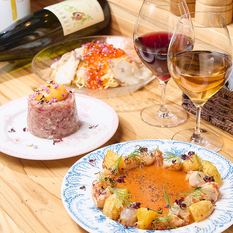 当店では、料理に合わせ、日替わりでグラス8種類、ボトル10種類の厳選ワインを取り揃えています♪シャンパンも豊富にご用意しており、ワインの総数は約30種類に。店主が自ら厳選した貴重なワインやシャンパンを、特別なひとときにぜひご堪能ください。お料理との相性も抜群です◎※メニューは日替わりのため一例です
