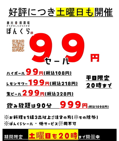 毎日20時まで ハイボール99円(税別)、レモンサワー199円(税別)、生ビール299円(税別) ぼんくらが全力で応援する企画です。※条件に関しては店舗にご確認下さい