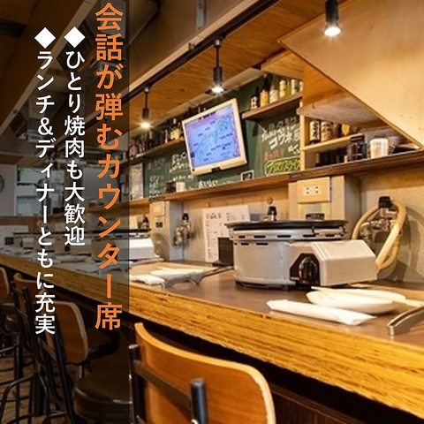 【会話が弾むカウンター席】カウンター席でも焼肉を満足いくまで楽しめる!お一人様でも気兼ねなく利用できるカウンター席は8席ご用意。カウンターにもコンロが完備されており、お一人様やデートでの利用にも最適なお席◎