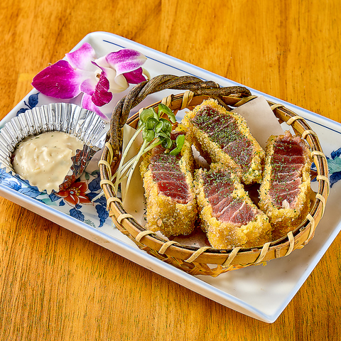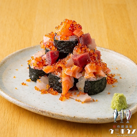 当店が自信を持って提供する【四大名物】は船橋での夜に彩りを添える逸品揃いです。溢れんばかりの「海鮮こぼれ盛り」サクサクとレアな食感が癖になる「サーモンレアかつ」見た目も可愛い「ウミボウズもなか」そして濃厚な「痛風ユッケ」まで。焼き鳥や海鮮を極めた職人が手掛ける、至高の美味しさをぜひご堪能下さい。