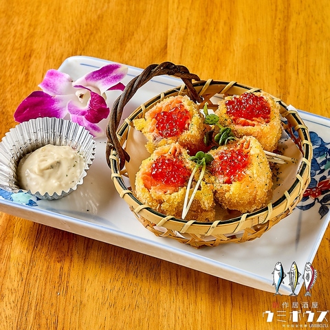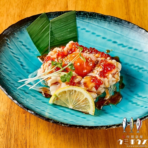 当店へお越しの際は、絶対に外せない「四大名物」をご堪能ください。鮮度抜群の海鮮が器から溢れ出す「海鮮こぼれ盛り」をはじめ、絶妙な火加減の「サーモンレアかつ」、見た目も楽しい「ウミボウズもなか」、そして濃厚な旨味が堪らない「痛風ユッケ」など、船橋での夜を彩る個性豊かな自慢の逸品を心ゆくまでお楽しみ下さい。
