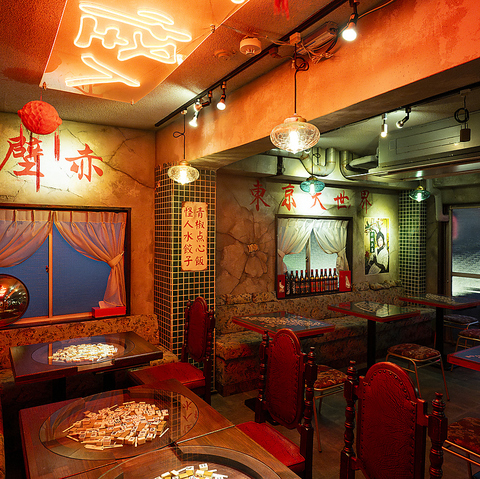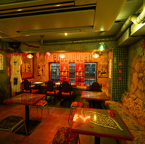 【雰囲気抜群】店内に入ったらそこは台湾?アングラな怪しい空間に遊び心ある内装は何か居心地の良さを感じる異空間。人気の麻雀テーブル席で食べる中華、、、なんか良い。オシャレな空間の中に下町のノスタルジーある酒場をイメージした店内はデート、女子会、友人、宴会どんなシーンでも使える店内で自慢の中華とお酒を!