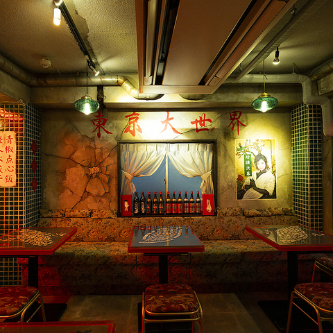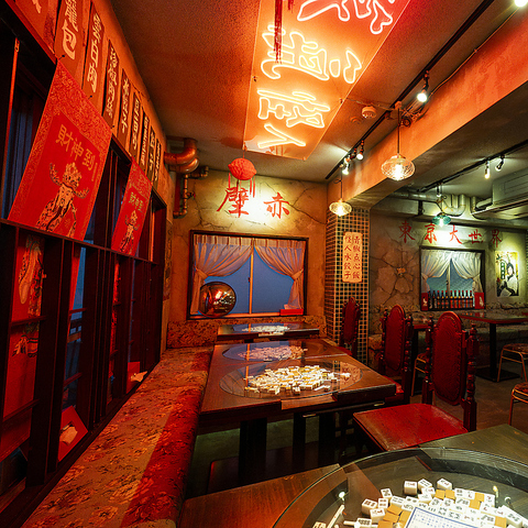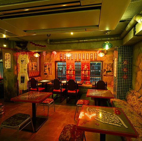 【雰囲気抜群】店内に入ったらそこは台湾?アングラな怪しい空間に遊び心ある内装は何か居心地の良さを感じる異空間。人気の麻雀テーブル席で食べる中華、、、なんか良い。オシャレな空間の中に下町のノスタルジーある酒場をイメージした店内はデート、女子会、友人、宴会どんなシーンでも使える店内で自慢の中華とお酒を!