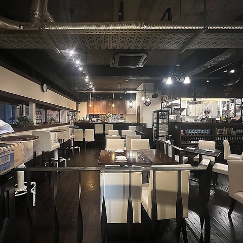 テーブル席からはおしゃれなワインボトルが並んでいるのも見えます♪お好きなワインをすぐに飲める♪