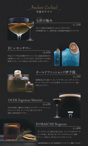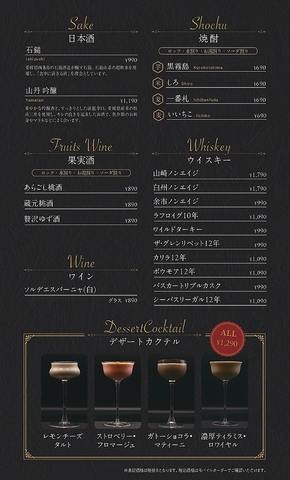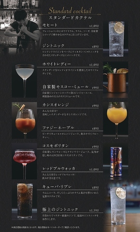 生ビール付きでカクテル、ワイン、焼酎やノンアルコールも充実しております。特に世界大会で過去2位受賞経験のあるマスターのカクテルは種類も豊富です!