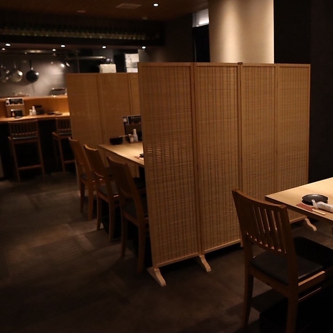 【テーブル席】パーテーションで仕切られ、プライベート感を大切にした空間。落ち着いて食事や会話を楽しめる、居心地の良いお席です。