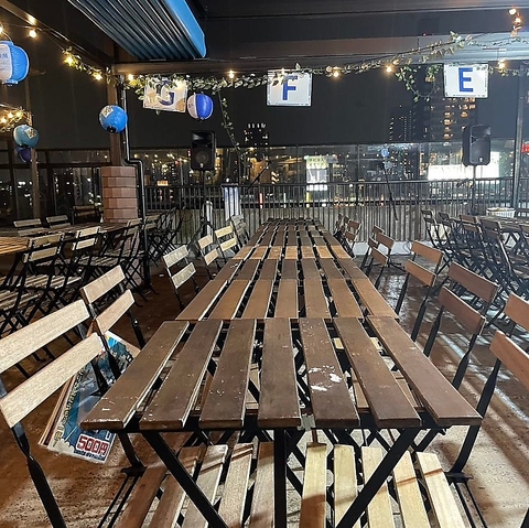 駅直結の立地にある屋上ビアガーデン。開放感満点で、天満橋の街並みを一望できるロケーションです。