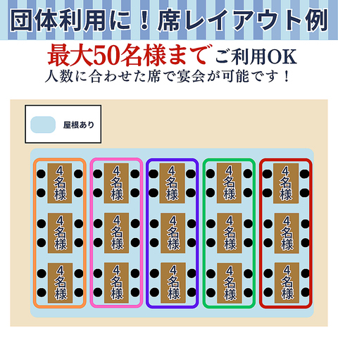 会社宴会やグループでの集まりに最適です!美味しい料理とお酒を堪能しながら、賑やかなひとときを過ごしませんか?最大50名様まで対応可能です!寒い季節はストーブを完備し、あたたかくお過ごしいただけます!