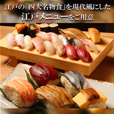 江戸の四大名物食である「すし」「天ぷら」「蕎麦」「うなぎ」をはじめ、「串焼き」など本格的な料理を提供