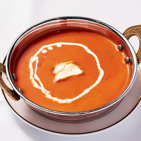 カシューナッツ、バター、生クリームを贅沢に使った、クリーミーなトマトベースのカレー。辛さは4段階からお選びいただけます。丁寧に長時間煮込んだ納得の逸品!!