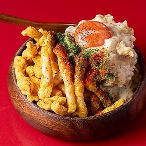 ダイナミックに串刺ししたスパイシーな味がやみつきになる「邪悪チキン」550円(税込)や、スナックや卵黄とのコンビネーションが人気の「文処のポテトサラダ」680円(税込)、当店名物の石焼き麻婆豆腐880円(税込)は+200円(税込)で麻婆飯でのご提供もOK◎ぜひご賞味いただきたい逸品です♪