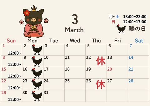 月~土: 18:00~23:00 (料理L.O. 22:30 ドリンクL.O. 22:30) 日: 12:00~17:00 (料理L.O. 16:30 ドリンクL.O. 16:30) 毎週月曜日は「鶏の日」で焼き鳥が登場! |