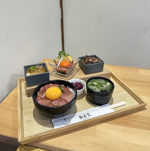 京都の有名焼肉店の料理長が監修!カフェで高級国産牛がリーズナブルに堪能できるこだわりランチ♪召し上がっていただく前に軽くバーナーで炙るためライブ感もお愉しみいただけます◎コチュジャンと醤油を合わせた甘辛ダレも別添えでご用意しているため、お肉本来の旨味とタレの風味で二度味わえます!