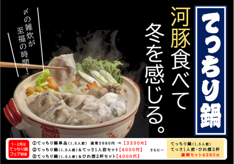 1/5~2/28限定でてっちり鍋フェア開催♪てっちり鍋やてっさ、ひれ酒をお得な価格でお愉しみいただけます!