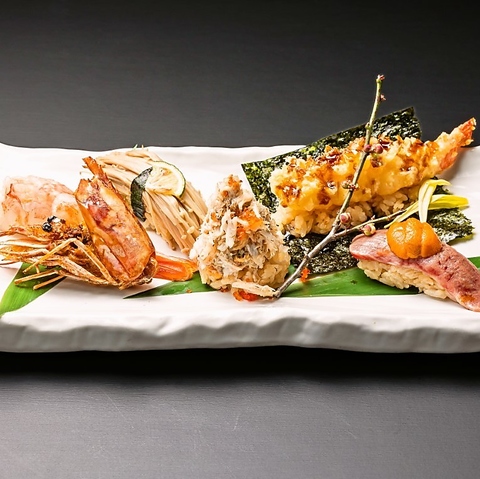 極上の味わいを追求するために仕入れからこだわり、厳選された食材を使用した内容おまかせの10貫盛り。王道のマグロやぷりぷりのエビなど、その日一番美味しくお召し上がりいただけるネタを選定し、丁寧に端正に握ります。豊富にご用意した焼酎や地酒とともに新鮮な魚介の旨味を存分に心ゆくまでご堪能ください。