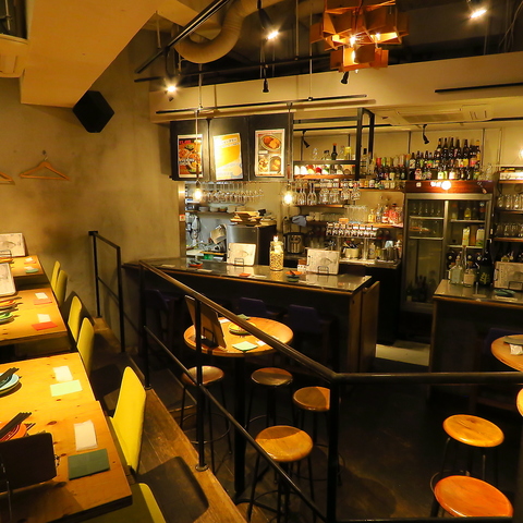お洒落なアートが壁に飾られ、柔らかく暖かい明かりに包まれた空間♪木目を基調としたお席が心地よさを演出している小洒落た地下空間。広々としたテーブルのカウンター席では気さくなスタッフ達とのおしゃべりも楽しめます!女性お一人のお客様にもおすすめ!こだわりインテリアの店内でのんびりリラックスしたひとときを♪