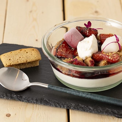 当店定番! 飲んだ後でもサッパリ食べられる! プレーンフィナンシェ アマランサス・フランボワーズアイス・ライチアイス・レアチーズムース・クランブル・カラメリゼしたストロベリー・ミックスベリーソース・ストロベリージュレ・クラシックパンナコッタ