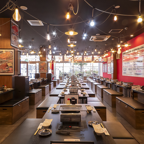 明るい照明が広がる100席以上の店内で、大衆焼肉を楽しむならここ!セルフオーダー制でBBQ気分も味わえ、時間無制限の飲み放題は【お得】が満載!キムチやサンチュは食べ放題!全12席のテラスでは風が抜け、臭いもつきにくいので、気兼ねなく楽しめます。