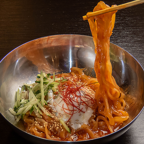 本格ビビンバをの聚楽の園風にアレンジを加えたビビン麺♪絶対的自信作です!脂っこさがなく、焼肉の後でも重く感じずに食べられる!焼肉の脂やタレの濃厚さを、ビビン麺の酸味と辛味が中和してくれます♪口の中がさっぱりして、満足感がさらにアップ!