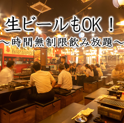 明るい照明が広がる100席以上の店内で、大衆焼肉を楽しむならここ!セルフオーダー制でBBQ気分も味わえ、時間無制限の飲み放題は【お得】が満載!キムチやサンチュは食べ放題!全12席のテラスでは風が抜け、臭いもつきにくいので、気兼ねなく楽しめます。