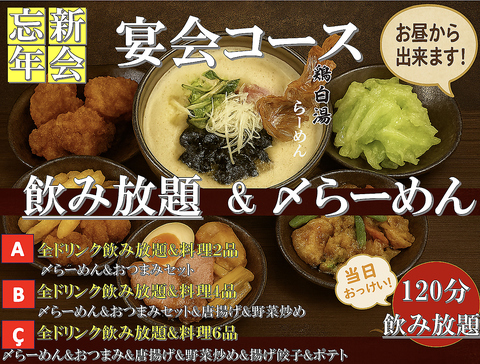 忘新年会期間限定。宴会プランございます。飲み放題付き料理2品から6品コース。締めはラーメンで大満足