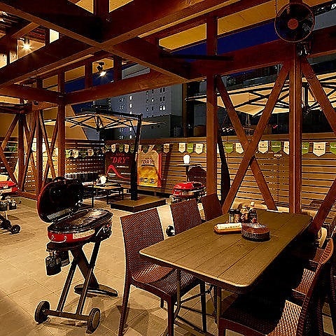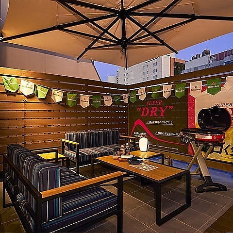 【テラス貸切:最大44名様】昼でも夜でもご利用可!大人数でのご宴会に最適◎グランピング施設のような広々空間は、プライベート~ビジネス利用まで。貸切利用のみ13時~(昼利用)のご相談承ります。※テラス席はビアガーデン利用のみ/屋根・パラソル付/夏場は扇風機・冷風機あり/冬場はブランケット・ストーブあり。
