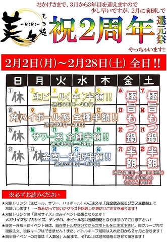 おかげさまで、3月から3年目を迎えますので少し早いですが、2月に前倒しで2月2日(月)~2月28日(土)までの全日で開催いたします♪♪この機会に是非ご利用ください!