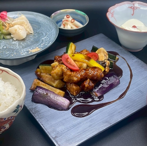中国料理にフレンチのエッセンスを加えた"新感覚の中華”。ランチは、彩り豊かな週替わり定食と多彩な麺料理をご用意しました。ちょっと贅沢なお昼に、ぴったりです。※写真は一例です、週によって内容が変更します。メイン(一品料理) 副菜 漬物 新潟こしひかり スープ 杏仁