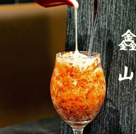 〆のデザートにピッタリな「金山いちご」は完熟苺をそのまま凍らせて削っています♪ふわふわで口当たりも◎