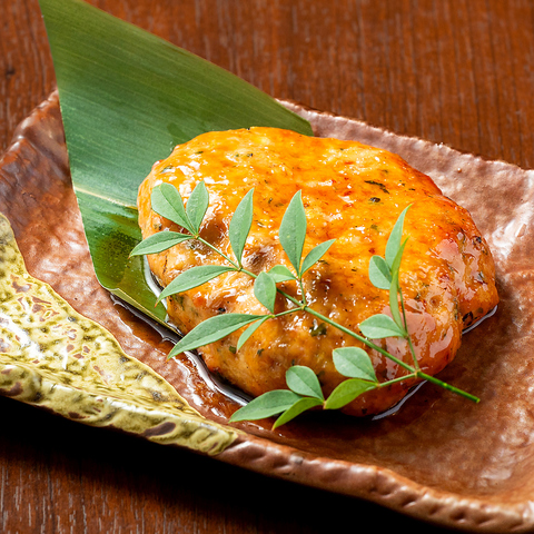 名古屋コーチン、恵那どり、奥三河どりを使って作った、自家製のつくねです。隠し味の大葉の香りが食欲をそそります。