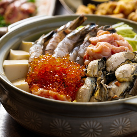 牡蠣に白子、あん肝、いくら、そして海老が入った旨いもの満載の通風鍋!期間限定です!