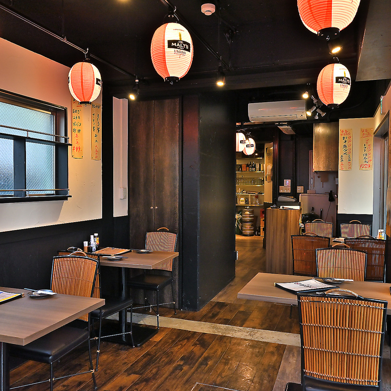 飾られたちょうちんが目を引く店内、広々としたテーブルではたくさんのお料理を並べてゆったりと楽しむことができます。暖かい雰囲気と笑顔がお客様をお迎え。心地よいひとときを提供いたします。和の風情が広がる、くつろぎの空間でお料理とお酒をお楽しみください♪お一人様も大歓迎です!